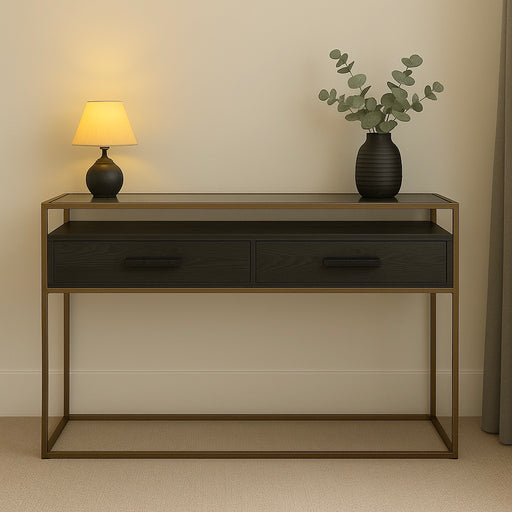 The Harrington console table features a dual draw set inside of a minimal dark bronze metal frame. The glass top sits neatly within the frame - the...
