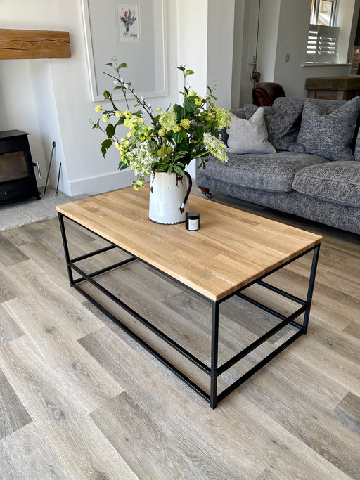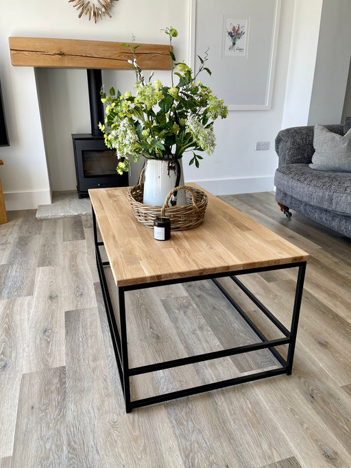 Combing a solid oak top with a sleek matte black powder coated frame gives this Coffee Table a natural but modern look. The simple design means it ...